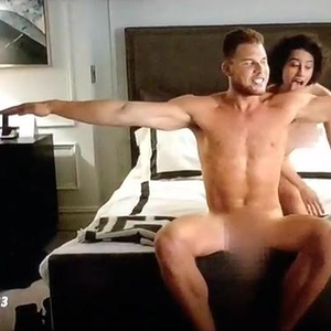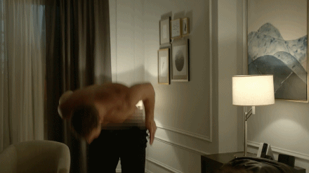 从gif图中,我们看到格里芬和女主角不仅在床上激吻,还有脱掉自己衣服,全裸和女主角共同嬉戏跳舞的画面,而Ilana Glazer也豁出去了,伸出自己的舌头,在格里芬的身后投入的舔着格里芬的臂膀。