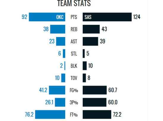 124-92,圣安东尼奥马刺在主场完成了一场屠杀式的胜利,俄克拉荷马城雷霆整场比赛毫无还手之力,他们全场比赛只在开场0-2时由凯文-杜兰特投中一记16英尺后仰跳投追平比分,此后始终保持落后直到比赛结束。