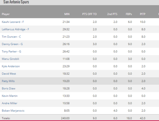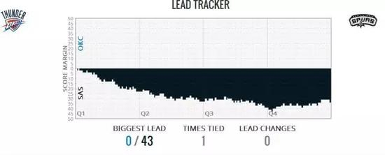 整场比赛,马刺队领先的分数最多时达到了43分,43分恰好也是马刺队在首节所得到的分数,他们在第一节就确立了23分的巨大领先优势。
