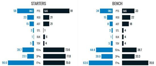 马刺全场比赛把握住了三种最为高效的进攻方式,这也是他们的取胜之匙。第一,篮下。他们依靠杀伤篮下获取在油漆区的得分的机会,他们在这一区域得到了42分,净胜雷霆8分。