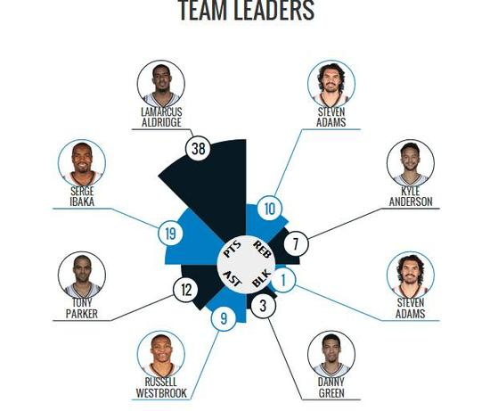 雷霆本赛季常规赛的场均助攻数为23.0个,而他们本场比赛恰巧为23个,基本达标。然而,作为常规赛场均助攻数高居联盟第三位的马刺,则比雷霆队多送出了16个助攻。