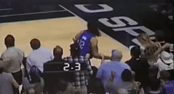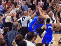 在距离比赛结束还剩2.2秒时,雷霆队中锋史蒂文-亚当斯在倒地后起身时,遭遇了马刺主场一名球迷的拉拽,亚当斯怒不可遏的一把闪开自己的手臂,转身回到篮下。