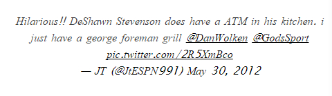 本图翻译:@JtESPN1991:太搞笑啦!!德肖恩·史蒂文森的厨房里面有一台自动取款机。我只有一台乔治·福尔曼的拳王烤炉。 @DanWolken @GodsSport