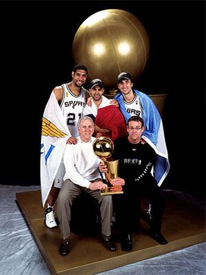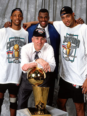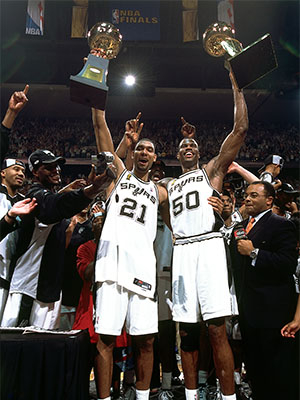 在邓肯加入马刺的第二个赛季,NBA总冠军奖杯就光临圣安东尼奥。在总决赛中,邓肯场均27.4分和14个篮板带领马刺4比1轻松击败拥有明星球员拉特利尔·斯普和阿兰·休斯敦的纽约尼克斯。同年,邓肯收获总决赛最有价值球员,入选最佳阵容和最佳防守阵容。