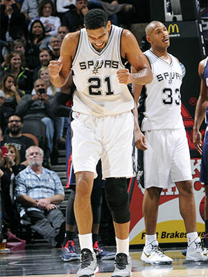 39岁的蒂姆·邓肯仍然被大家球迷亲切的称呼为“21号新秀。”15次入选全明星,15次最佳阵容和15次最佳防守阵容让他的历史地位不断攀升。他成为美职篮历史上38岁以上唯一一名保持场均13分9篮板以上的球员。邓肯在该赛季被评选为特威曼·斯托克斯最佳队友奖。常规赛55胜的马刺队在季后赛第一轮七场大战不敌洛杉矶快船。波波维奇在赛后说道:“我持续对蒂姆·邓肯的表现感到惊讶,39岁的他是我们球队季后赛中,保持发挥最稳定的球员。”这个赛季,邓肯场均拿下13.9分9.1个篮板,同时入选全明星,最佳三阵和最佳防守二阵。