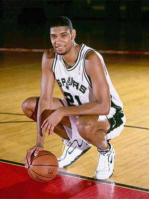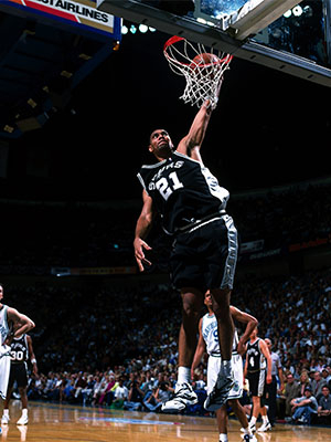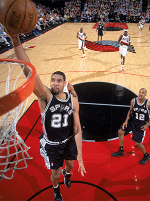 1997年NBA选秀大会上面,圣安东尼奥马刺队拿到了状元签,随后他们毫不犹豫地摘下了来自维克森林大学的邓肯。在前一个赛季中,1987年状元大卫·罗宾逊由于伤病影响缺席了大半个赛季。而后,伤愈的罗宾逊与新秀邓肯的内线双塔组合也成了一代佳话。这个赛季,马刺队的胜场数从之前的20场提高到了56场,30场的胜场差也打破NBA的记录,邓肯的功劳功不可没。邓肯在这个赛季交出场均21.1分,11.9个篮板以及2.5次封盖的完美数据,被选为NBA年度最佳阵容和最佳防守第二阵容。值得一提的是,他在每个月都被评为最佳新秀并当选年度新秀。