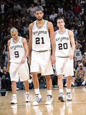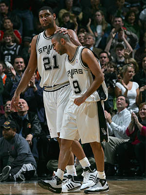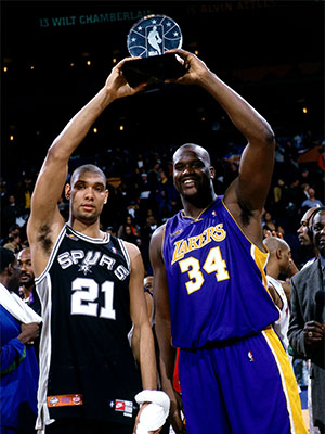 2003年5月,在马刺队的新主场AT&T中心,邓肯与罗宾逊肩并肩捧起NBA总冠军奖杯的瞬间,成为马刺历史上最难忘的时刻之一。邓肯同时收获当年NBA最有价值球员,NBA总决赛最有价值球员,也入选最佳阵容和最佳防守一阵。在总决赛第六场面对新泽西篮网队的比赛中,邓肯砍下21分20篮板10助攻以及8次封盖的准四双恐怖数据,震惊篮球界。同年,大卫·罗宾逊选择退役,曾经的双塔瓦解。