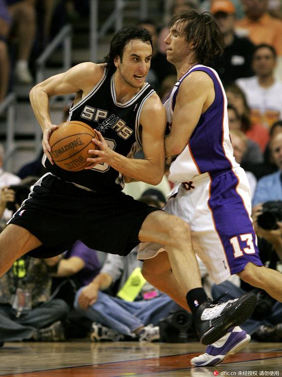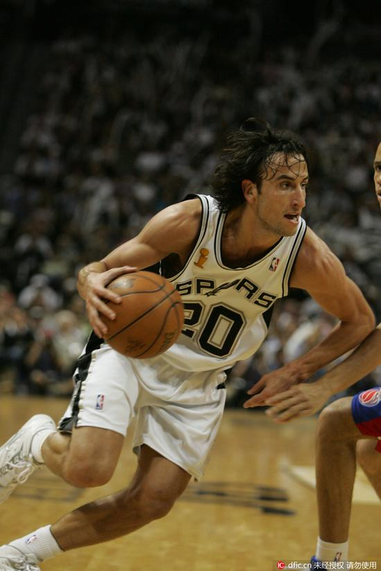 03-05年,马努一直是一头飘逸的长发,他也是披着这头长发,在2005年总决赛中一次次杀入活塞的阵地,帮助马刺最终拿到了总冠军。