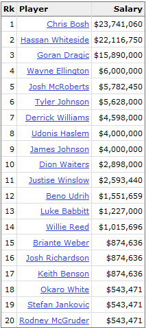 流出:韦德(公牛)、波什(生病)、洛尔-邓(湖人)、乔-约翰逊(爵士)、杰拉德-格林(凯尔特人)、阿马雷-斯塔德迈尔(从NBA退役后签约以色列联赛)