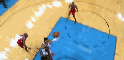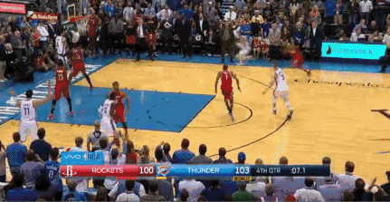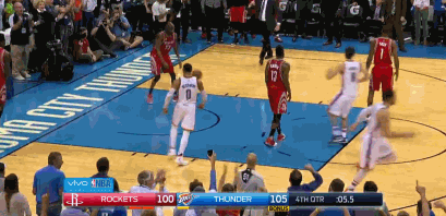 比赛打到此时,雷霆仍然可以稳稳将球发出后,等待对手采取犯规战术,但威少似乎并不甘心就这样结束比赛:终场前5.5秒,雷霆开底线球,阿布里恩斯发球,威少从边路加速横切,接到传球之后,并没有选择将球运出外线,而是踩着禁区线起跳,面对卡佩拉的防守,直接来了一记隔人暴扣!