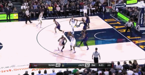 然而,就在克里斯重新回到自己的防守位置之前,戈贝尔直接跑向迪奥去做挡拆。克里斯勉力挤过挡拆想要跟上,钱德勒上前一步防止迪奥造次。在其他人紧跟自己的防守人的情况下,这就给了戈贝尔杀向篮筐做一个无人防守的空接的机会。