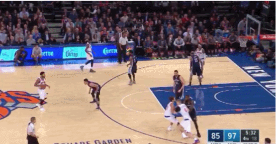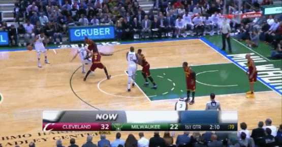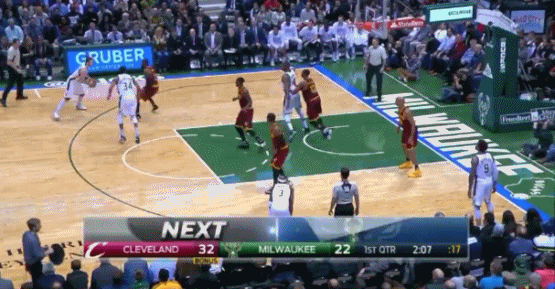 雄鹿利用这个特性的其中一个方式,就是让他在一个回合中同时扮演两个角色。下面这两张动图,你能看到字母哥作为持球人和德拉维多瓦打了一个挡拆,随后把球给外面的德拉,之后再做一回掩护。骑士完全不知道该怎么防,最终给了一个空位的抛投。
