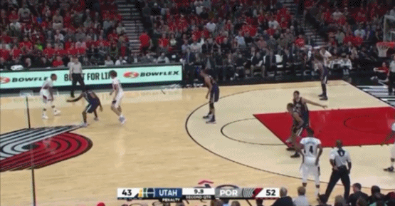 随着利拉德冲向戈贝尔发起攻击,在三分线做个假投动作或者做个顿步,都会让防守更难以阅读。加上利拉德的手活儿快如装了小马达,一次步点没踩准就能让他一马平川杀向篮筐。