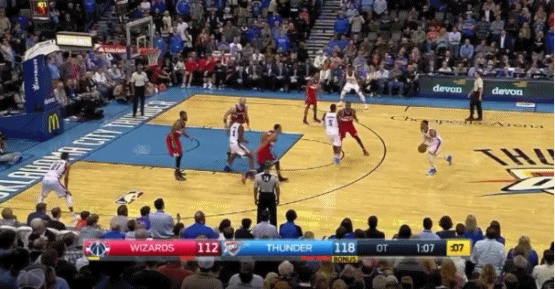 雷霆在此基础上更进了一步,让强行掩护人都做了弹开或者顺下的动作。由于奇才逢掩护必换,威斯布鲁克在他干拔的前5秒面对过三个不同防守人。