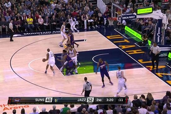 然而,就在克里斯重新回到自己的防守位置之前,戈贝尔直接跑向迪奥去做挡拆。克里斯勉力挤过挡拆想要跟上,钱德勒上前一步防止迪奥造次。在其他人紧跟自己的防守人的情况下,这就给了戈贝尔杀向篮筐做一个无人防守的空接的机会。