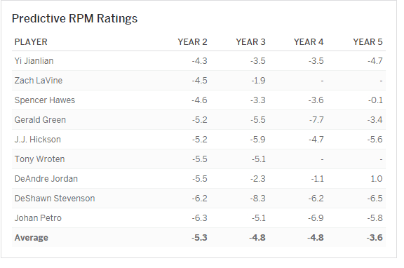 唯一有例外的是德安德烈-乔丹。他在第五年将预期RPM提升到+1.0,其他球员都是负数。小乔丹的例子证明,生涯初期的预期RPM低不算什么,后期还有提高的机会,小乔丹的巅峰百回合RPM是+4.0。