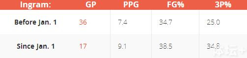 英格拉姆这个赛季的表现并没有达到人们对于他榜眼秀身份的预期,他的投篮命中率只有36%,三分球命中率更是低至28.7%。而且他消瘦的体型看起来还没适应NBA级别的对抗。不过即便是这样,进入新年之后的英格拉姆还是有一些进步的,我们通过这个表格来看一下。