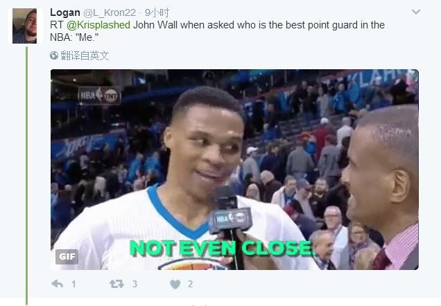 一位名为“Logan”的球迷贴出了第三张动图,图中,记者在场边采访威少。威少摇摇了头,说了句话,图片上给出了字幕:“(第一控卫?)边都没沾呢。”