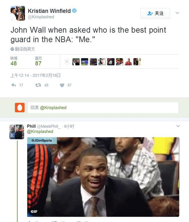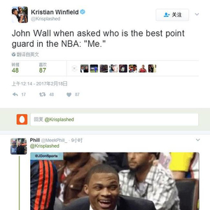 今天,SBnation的记者克里斯蒂安-温菲尔德采访了沃尔,他问沃尔谁是当今联盟最佳控卫,而沃尔回答得非常直接:“我(Me)。”