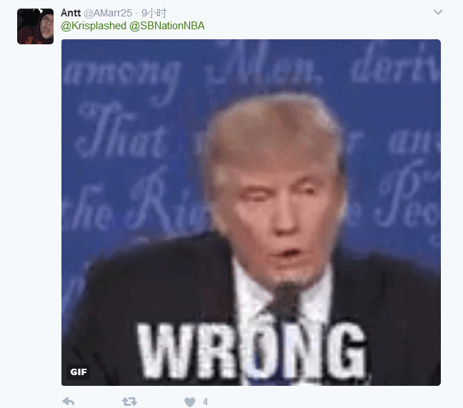 接下来,还有三名球迷贴出动图嘲讽沃尔,一人贴出了美国总统特朗普说“错误”的动图。一人贴出了库里赛后新闻发布会上逗女儿的图,图中,库里女儿小莱莉说:“闭嘴。”还有一人则贴出了詹姆斯-哈登著名的“歪头走人不屑回答”图。
