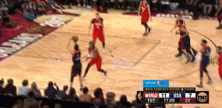 上半场17分26秒,美国队发动快攻,布克接唐斯的击地传球,从右侧溜底线反身上篮。这一球虽然难度不大,但布克的动作潇洒自如,在空中还有行走换腿的动作,简直和当年的迈克尔-乔丹、科比-布莱恩特如出一辙。