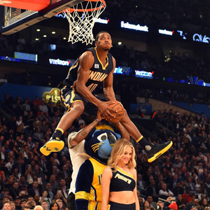 在决赛中,罗宾逊第一扣选择让老大保罗-乔治背身持球,罗宾逊飞越乔治后完成小拉杆扣篮。在前两次尝试中,罗宾逊都失败了,毕竟乔治的身高太高了,比一般飞越的人都要高很多,好在他第三扣成功了,拿到了44分。
