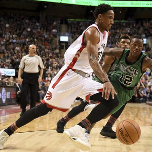 下半场猛龙开始反击,在第三节还有2分24秒时以74-70超出,德罗赞本节拿下了12分。不过在本节剩下的时间,猛龙一分未得,凯尔特人连得7分,以77-74结束前三节。
