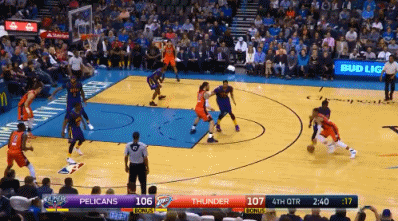 至此,雷霆已经完全把握住了比赛的主动权,但威少并未就此收手,下一回合,他又运球突破长驱直入,潇洒地单手上篮命中。然后,两次一个人单挑对方整条防线,造成犯规四罚全中。终场前30.8秒,威少再次完成突破暴扣,为这场华丽的个人秀画上完美句号。