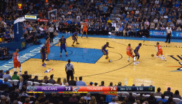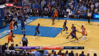 果然,比赛的前半场鹈鹕双星闪耀,浓眉第一节就拿到24分,表妹第二节接过大枪,也单节独取19分。相比之下,威少第一节就出现4次失误,半场打完只得10分的表现,则失色许多。