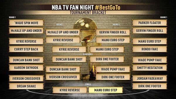 经过长达4个月的激烈角逐,吉诺比利的欧洲步一路击败了拉简-隆多的单手假动作、格文的指尖挑篮和德克-诺维茨基的金鸡独立投篮,进入决赛,并最终以74%的得票率力压凯里-欧文的变向运球,成为最受球迷欢迎的NBA球星招牌动作。