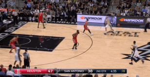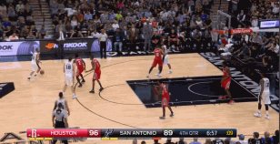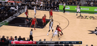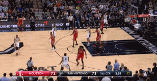 进入末节,莱昂纳德在6分51秒时单打戈登,利用脚步和身高优势中距离跳投将球命中。随后在比赛进行到最后5分钟时,莱昂纳德上线持球进攻,面对哈登的防守,他直接选择在三分线外出手。毫不犹豫的投篮,为马刺在关键时刻紧咬比分。