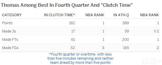 上表展示了小托马斯在第四节和关键时刻(比赛时间少于5分钟,分差小于5分)的恐怖表现。他的关键时刻得分、三分命中数和罚球命中数全部位列全联盟第一,投篮命中排在第3。第四节方面,他的得分、罚球命中数排名第一,三分命中数和投篮命中数都排在第二。