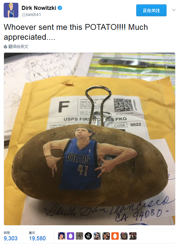 北京时间3月16日,达拉斯小牛队巨星德克-诺维茨基,在社交媒体上晒出了一位粉丝送给他的礼物:一个土豆。