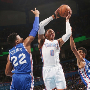 值得一提的是,这是威少职业生涯第5次在面对76人队时得到三双,超过了他面对其他任何对手时的三双次数。