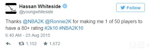 这还没完,在2015年夏季联赛期间,怀特塞德坐在现场观战,他身上穿的一件T恤成了媒体关注的亮点,因为上面写着“只是希望能提升我的2K能力值。”后来到了八月底,怀特塞德得知自己在2K16中的评分达到了81,成为游戏中为数不多的超过80的球员。这次,怀特塞德终于满意了,随后他还在推特上感谢了2K公司。