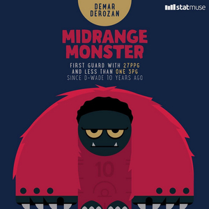 本赛季德罗赞虽然场均能够得到27.3分,但是他场均三分球出手只有1.7次,场均命中三分球只有0.5个。投篮热区数据显示,德罗赞在三分线外的进攻只占出手的8.1%,这样一位中距离怪兽也是近10年来首次出现。德罗赞8年的职业生涯中,每个赛季场均三分球命中数都低于1,职业生涯场均更是只有0.4个三分球入账。