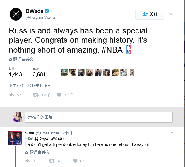 而显然韦德并没有注意到这缺少的一个篮板,他发布了一条推特,祝贺小兄弟威少创造历史。“拉塞尔是,也一直都是个特别的球员。祝贺他创造历史,没有什么比这更神奇的了。”