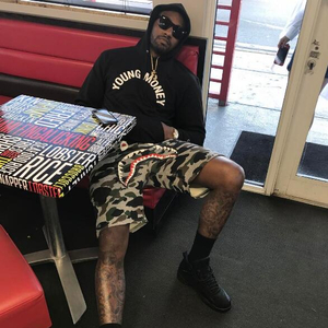 黑色连帽卫衣配一副墨镜,却都被下半身的短裤抢了镜,一条大鲨鱼跃然于上,凶猛十足,仿佛胯下大有杀气。