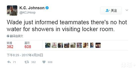 芝加哥公牛队的跟队记者K.C.约翰逊在自己的推特上写道:“韦德已经通知了队友们,更衣室里面不能洗热水澡。”