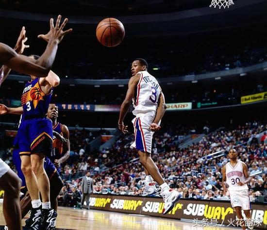 在球迷的印象中,艾弗森的形象大部分是地垄沟头,而这张照片的艾弗森却是短发。这是97年在76人对太阳的一场比赛中,艾弗森背后传球。
