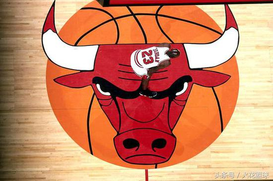 1998年是乔丹在公牛队的告别赛季,本照片拍摄于那一年,乔丹站在联合中心公牛队巨大牛头队标中间,整个镜头俯拍的相当有艺术感。
