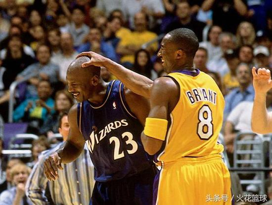 2003年,当时的乔丹再次复出在华盛顿奇才队效力,1月2日在和湖人的一场比赛中,科比摸着乔丹的头开玩笑,估计整个联盟敢摸乔丹头的球员不多。