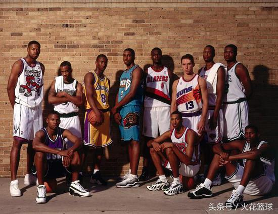 1996年NBA首轮选秀的球员在各支球队都是中坚力量,因此也被称为“96黄金一代”。从左至右:马库斯-坎比、雷-阿伦、斯蒂芬-马布里、科比-布莱恩特、阿朴杜勒-拉希姆、杰梅因-奥尼尔、科里-基特尔斯、斯蒂夫-纳什、约翰-华莱士、安东尼-沃克、萨马基-沃克。
