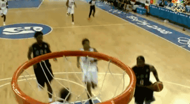 年轻的詹姆斯不仅在NBA赛场上喜欢用大风车,来到国际赛场也丝毫不吝啬。在北京奥运会上,詹姆斯就在中国球迷的眼前上演了这么一次平框大风车暴扣。