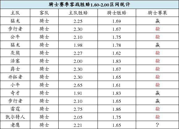 本场比赛,博彩公司为骑士开出的客战胜赔为1.65,主队老鹰为2.21。按照惯例,博彩公司一般会在赛前向主队示好,综合来看,骑士队的优势较为明显。值得一提的是,骑士队本赛季的客场战绩并不理想(15胜12负),尤其是胜赔在1.60-2.00的区间内时。