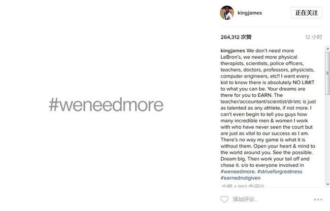 詹姆斯在Instagram上发了一张图片,图片是白底黑字,写着“we need more(我们需要更多)”。然后詹姆斯在一旁写道: 我们不需要更多的勒布朗了,我们需要的是更多的理疗师、科学家警察、教师、医生、教授、物理学家、电脑工程师等等! 我希望每个孩子都能明白,你的人生没有绝对的界限,不会限制你能成为什么样的人,你的梦想需要自己去争取。无论是教师、会计师、科学家还是医生等等这些职业,他们和运动员一样非常出色,甚至比运动员更需要天赋。