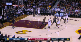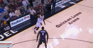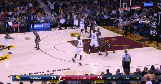 第三节还剩3分钟,詹姆斯在低位背身单打芬森,这次詹姆斯运球往篮下突破,但是没能摆脱芬森,而且遭遇双人包夹,无奈之下只能将球传给JR,但JR的三分不中。