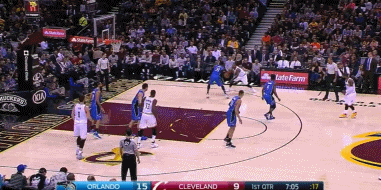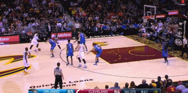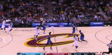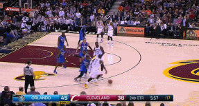 上半场结束时,主场作战的骑士还落后1分。但是第三节开始后,JR突然发威,本节骑士队的第一次进攻,JR就在左侧底角接欧文的助攻三分命中。