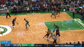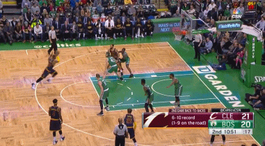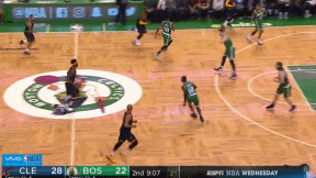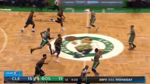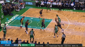 下半场,骑士队的进攻点逐渐打开,而詹姆斯也能适时地得分。第四节还剩7分半钟,詹姆斯接欧文的助攻完成一个空接上篮,得到他本场比赛的第30分。紧接着,詹姆斯在运球推进的过程中突然crossover过掉防守者克劳德,并完成一个2+1上篮。这一节,詹姆斯连续打出篮下进攻2+1,并逐渐摧毁凯尔特人的意志,直到对手投降并换下首发。