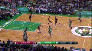 这一球发生在第二节比赛进行到还剩6分55秒时,当时詹姆斯刚刚率领众替补以一波20-4的狂攻,将场上分差拉开到15分。凯尔特人替补控卫马库斯-斯马特瞅准对方立足未稳,突然加速冲向尚未布置好的阵地防线,想要偷袭两分。